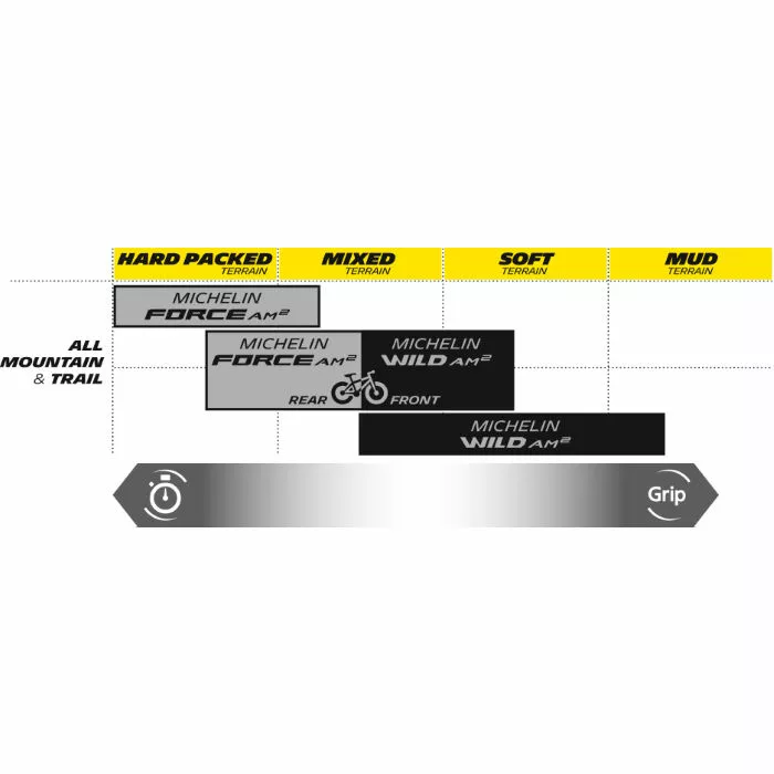 The Michelin Wild AM² has been designed for mixed to softer terrain where its more aggressive tread pattern ensures high levels of grip, but with a reduced focus on rolling efficiency. Tall centre blocks are inspired by those found on the Michelin DH34 tyre and offer a maximum ground penetration during braking for good stability and transfer of braking forces in soft conditions. The shoulder blocks are again inspired by the Michelin DH22 but are modified to increase bite in soft conditions for increased grip, stability and progressive handling in these difficult conditions.